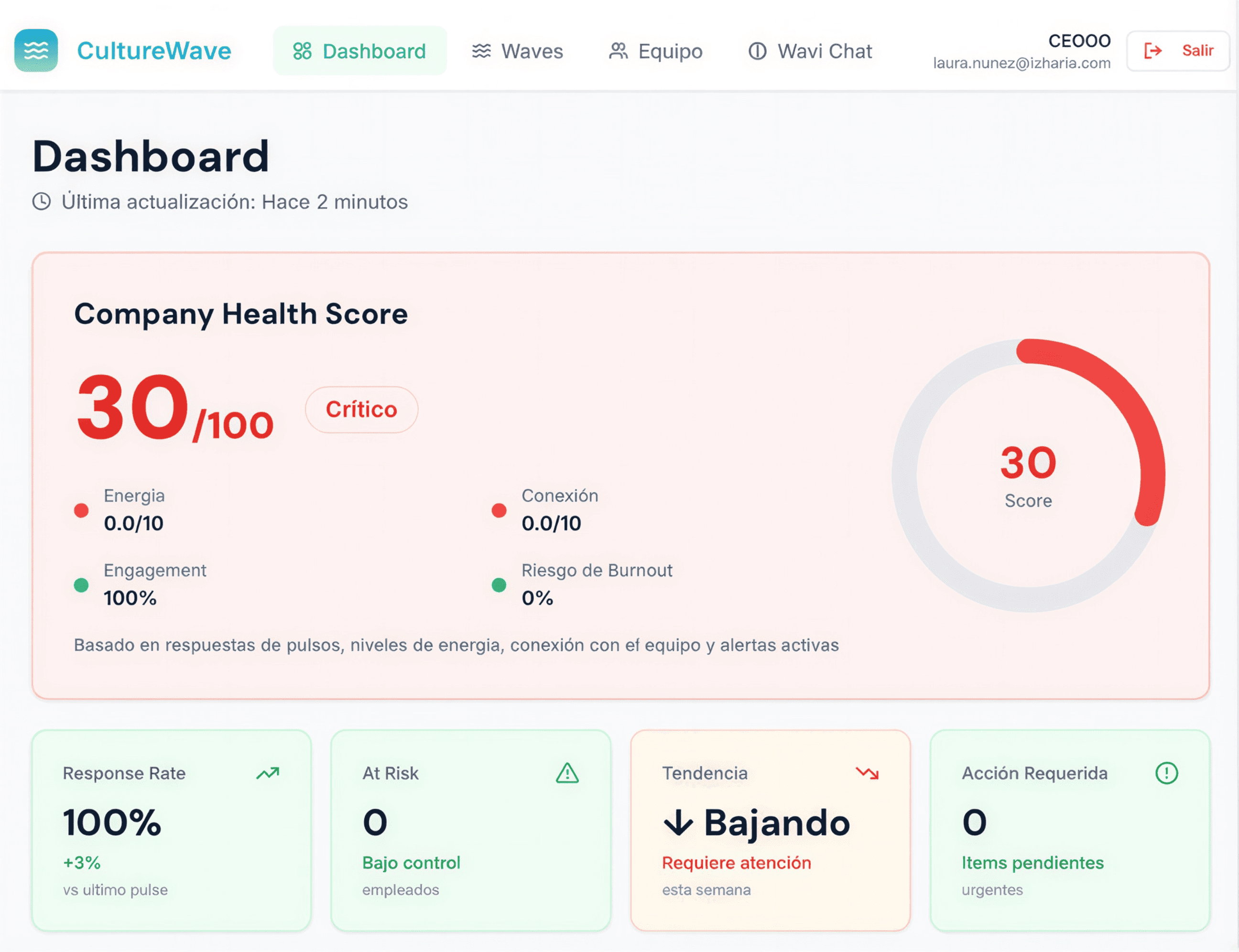 La IA analiza todas las respuestas de Waves y te da: - Cultural Health Score (78/100) - Alertas de desconexión - Pattern detection - Recomendaciones de contenido